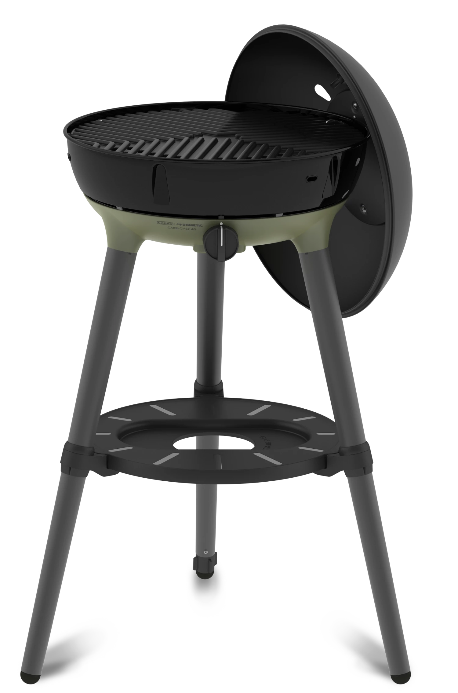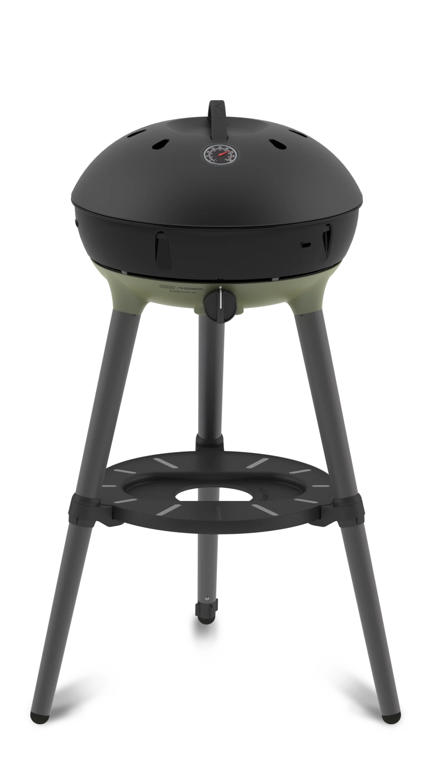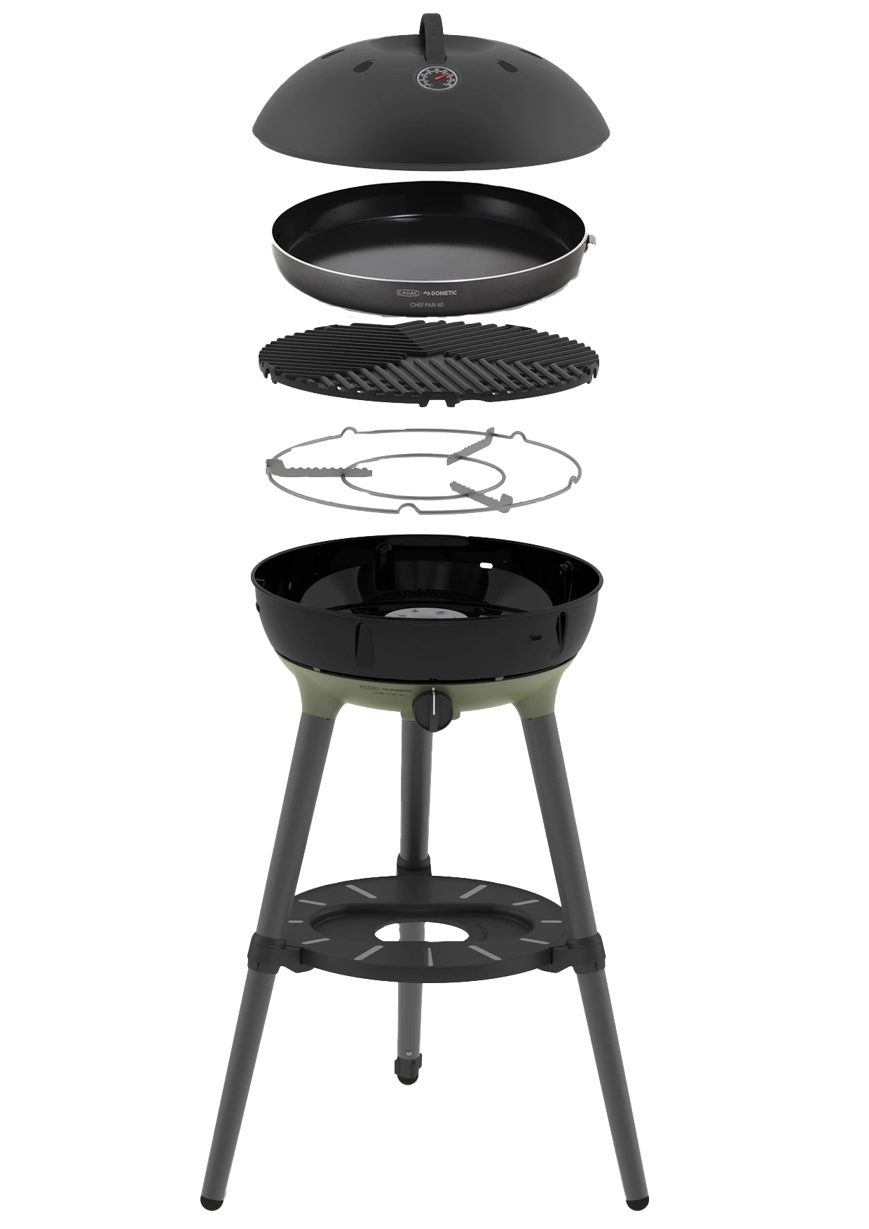 The dome lid, with stay-cool handle and thermometer, hooks onto the side of the BBQ to act as a windshield, and the utility shelf provides safe seating of the Cadac Power Pak gas supply.