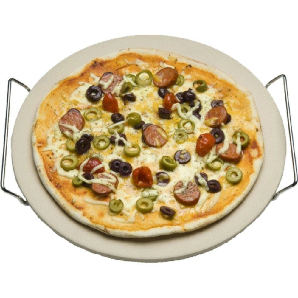The 33cm diameter pizza baking stone includes a chrome-plated wire holder for easy handling. The 10mm thick baking stone can withstand temperatures of 500ºC and can be used in electrical ovens, charcoal kettles, gas BBQs and in CADACs Carri Chef Deluxe, but not in gas ovens, to create a traditional or even the most creative choice of pizza.