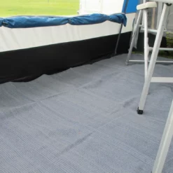 This Kampa Easy Tread carpet is an attractive deluxe awning carpet that will provide a warm, luxury feel to any caravan awning, motorhome awning, tent, gazebo or marquee. This 250cm x 600cm version is cut specifically to match the dimensions of awnings that are 250cms wide and have a 390cm projection from the caravan/motorhome wall. This Easy Tread Carpet features a close weave that makes it breathable so it won’t kill the grass but also won’t let any bugs through. It has a warm, non-slip finish that is easily cleaned with a quick hose-down. It comes in an attractive two-tone Blue/Grey weave to compliment most awning colourways and is hard wearing, rot proof and UV stabilized so it won’t fade. Comes complete with pegging eyelets and free groundsheet pegs with carry bag provided.