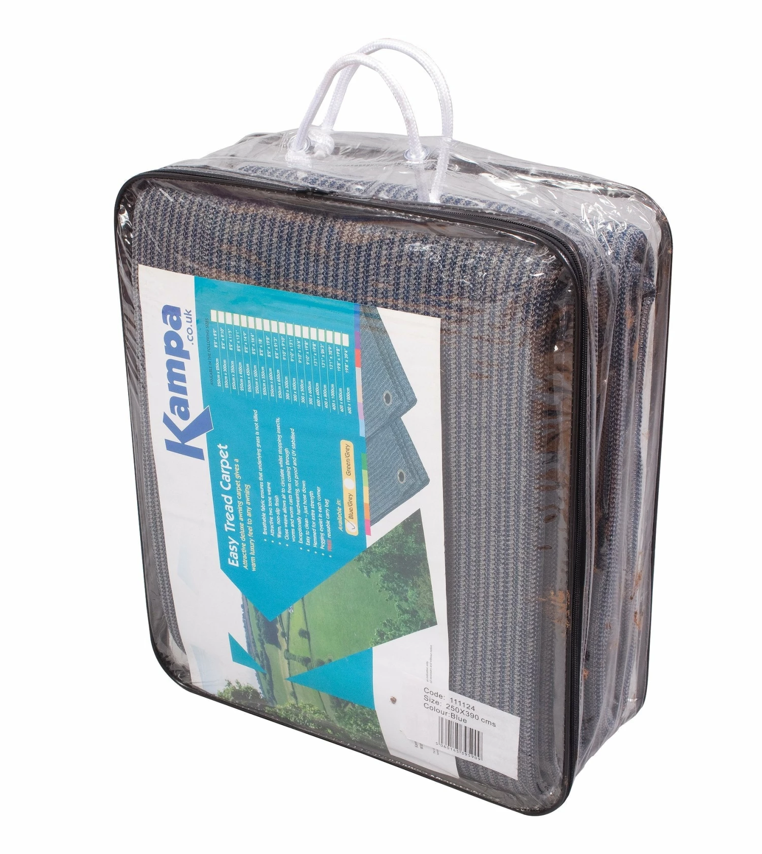 This Kampa Easy Tread carpet is an attractive deluxe awning carpet that will provide a warm, luxury feel to any caravan awning, motorhome awning, tent, gazebo or marquee. This version is cut specifically to match the dimensions of awnings that are 200cms wide and have a 250cm projection from the caravan/motorhome wall. This Easy Tread Carpet features a close weave that makes it breathable so it won’t kill the grass but also won’t let any bugs through. It has a warm, non-slip finish that is easily cleaned with a quick hose-down. It comes in an attractive two-tone Blue/Grey weave to compliment most awning colourways and is hard wearing, rot proof and UV stabilized so it won’t fade. Comes complete with pegging eyelets and free groundsheet pegs with carry bag provided.