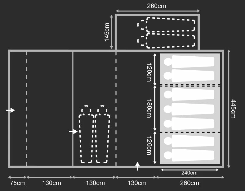 • 230cm deep, darkened Twilight micro polyester 7 person bedrooms with a 2/3/2 zip-in dividers