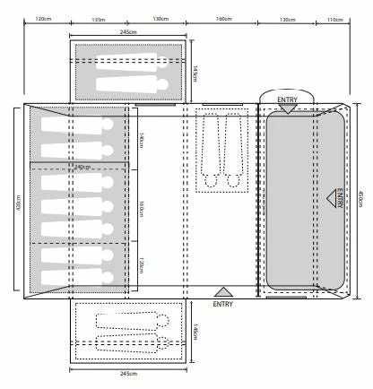 - 230cm deep, darkened Twilight micro polyester 7 person bedrooms with a 2/3/2 zip-in dividers