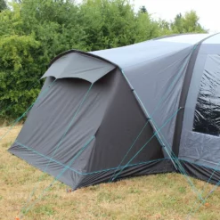 Introducing the all-new inflatable and lightweight Camp Star 700SE with new embossed fabric and stunningly sharp Teal trim. This seven-berth tunnel tent has the addition of a Side ‘Double Bedroom’ Annexe which has been so successful on the Airedale Range and offers the option of making this a 7 plus 2 person family tent. This new tent now represents excellent value ideal for families or groups seeking a spacious and versatile internal living space. The extra space is ideal if you have teenagers wanting their own privacy and space (Optional 2 Berth Inner available to convert to a bedroom), or can be used for extra storage, or even an offshoot toilet room! It is unrivalled in terms of functionality, flexibility, and innovation at this price point. The internal design offers the perfect allocation of usable space for families, split between a generous commune area with the option to add a Universal 2 berth inner tent also to make it a 7 plus 4. The darkened ‘Twilight’ fabric Seven-person bedroom that can be split down to a 2/3/2 configuration using the toggle in dividers, and a spacious enclosed front porch area. Our bedroom ventilation system, and ample mesh ventilation fly screen panels combined with crystal-clear window panels maintain an airy internal space and maximise airflow in warmer temperatures. The fully enclosed front porch provides an ideal area for relaxation, cooking, or dining, granting full protection against the elements. Outdoor Revolution understand that comfort has become a prerequisite for the modernized camper, which is why this tent comes complete with Dura-tread Carpet and a Footprint Groundsheet which you can choose to cover or not cover the front porch area. With new stunning looks, extra space and versatility we have upgraded the standard Camp Star 700 to make this new model the outstanding value family tent for 2023.