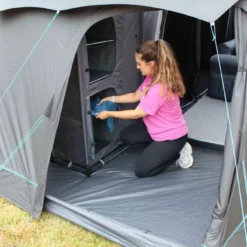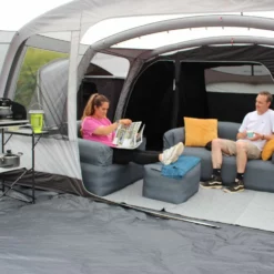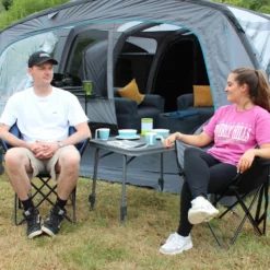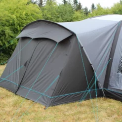Introducing the all-new inflatable Camp Star 900DSE with new embossed fabric and stunningly sharp Teal trim. This nine-berth tunnel tent has the addition of a dual Side ‘Double Bedroom’ Annexe which has been so successful on the Airedale Range and offers the option of making this a 9 plus 2-person family tent. This new tent now represents excellent value ideal for families or groups seeking a spacious and versatile internal living space. The extra space is ideal if you have teenagers wanting their own privacy and space as the right-hand bedroom comes complete with an inner 2 berth bedroom as standard. The opposite side annexe can be used for extra storage, or even an offshoot toilet room! It is unrivalled in terms of functionality, flexibility, and innovation at this price point. The internal design offers the perfect allocation of usable space for families, split between a generous commune area with the option to add another Universal 2 berth inner tent also to make it a 9 plus 4. The darkened ‘Twilight’ fabric Nine-person bedroom that can be split down to a 2/3/2 configuration using the toggle in dividers, and a spacious enclosed front porch area. Our bedroom ventilation system, and ample mesh ventilation fly screen panels combined with crystal-clear window panels maintain an airy internal space and maximise airflow in warmer temperatures. The fully enclosed front porch provides an ideal area for relaxation, cooking, or dining, granting full protection against the elements. Outdoor Revolution understand that comfort has become a prerequisite for the modernized camper, which is why this tent comes complete with Dura-tread Carpet and a Footprint Groundsheet which you can choose to cover or not cover the front porch area. With new stunning looks, extra space, and versatility we have created a large 9 person model, an outstanding value for money family tent bundle for 2023.