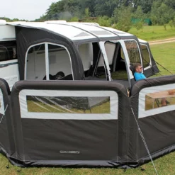 The Oxygen Windbreak is the most practical, flexible and innovative windbreak on the market for the new season. Joining Outdoor Revolution’s growing collection of exclusive registered designs; the premium five metre Oxygen Windbreak three paneled inflatable windbreak has been designed to effectively deflect wind for up to five metres around your touring arrangement, whilst featuring a coordinated design to complement the contemporary aesthetic of our latest caravan awnings, drive away awnings and family tents. This windbreak can be infinitely extended, as much as you desire, using our Optional Zip-On Panel Sections. Each section is flexibly hinged, enabling you to adjust the configuration of the windbreak to suit your personal preference. We have situated an upper window panel on each section, allowing you to retain an excellent outlook of any surroundings, whilst relaxing behind the windbreak. This windbreak can be attached to your caravan, using our Optional 6mm Kadar Strip.