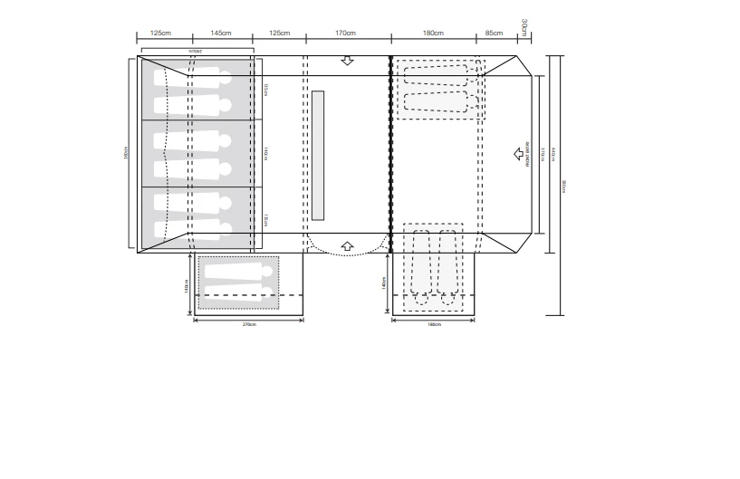 • 240cm deep, darkened micro polyester 6 person bedrooms with zipped 2/2/2 dividers