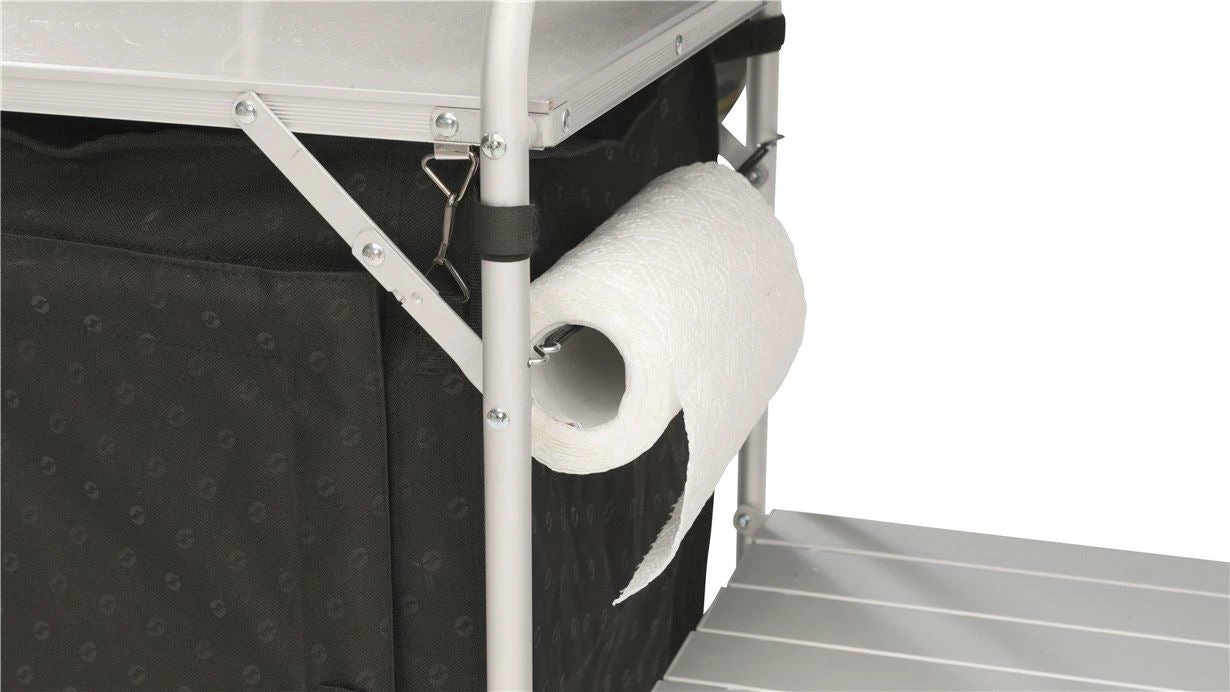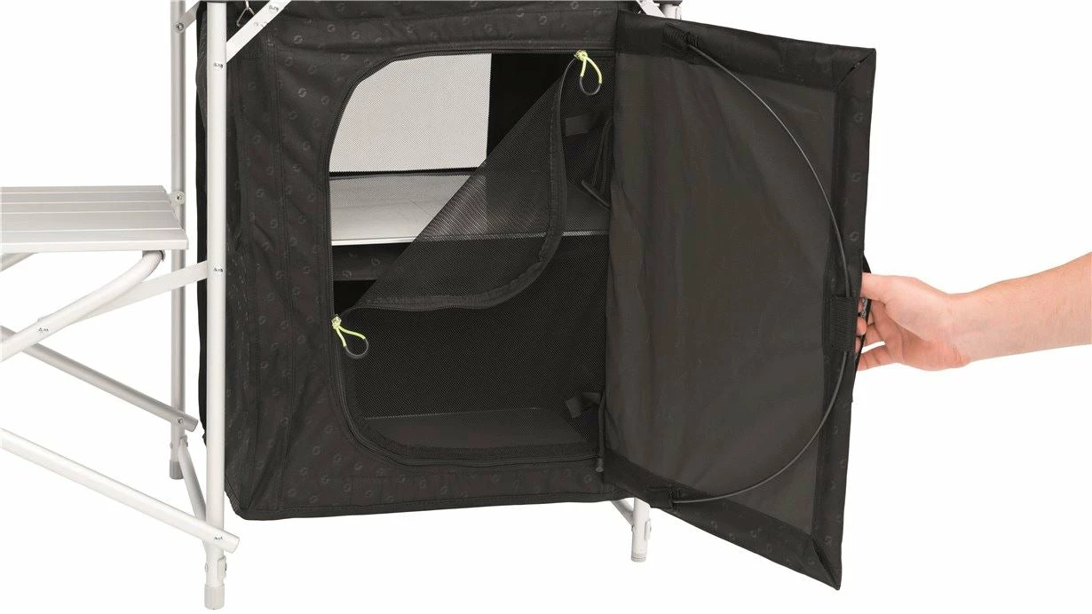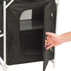 Create a safe kitchen area at your campsite with thanks to Outwell’s Camrose Kitchen Unit with table tops providing work space for preparing and serving food. The unit also includes a windshield allowing you to cook food with ease in windy conditions. The table storage space is made from durable embossed polyester fabric with zip closure that can be folded away neatly for access.