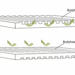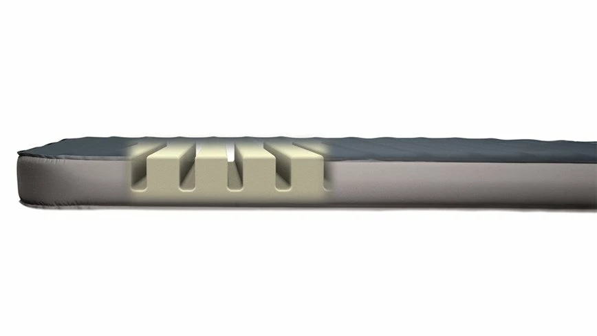 Ingenious heat regulation is achieved through offset air core sculpting which enables greater or less body heat retention depending on which mat side is slept on – a real performance boost when needed for optimum year round comfort. When the mat is turned with the air cores next to the body excessive heat can escape making it easier to cool down during warm summer nights. When the mat is turned the opposite way it gives the user the optimal insulation as the body heat is reflected by the foam. This option is used in colder nights. This air core design also offers campers a softer sleep sensation as well as better ease of packing, lower weight and neater packed size.