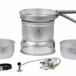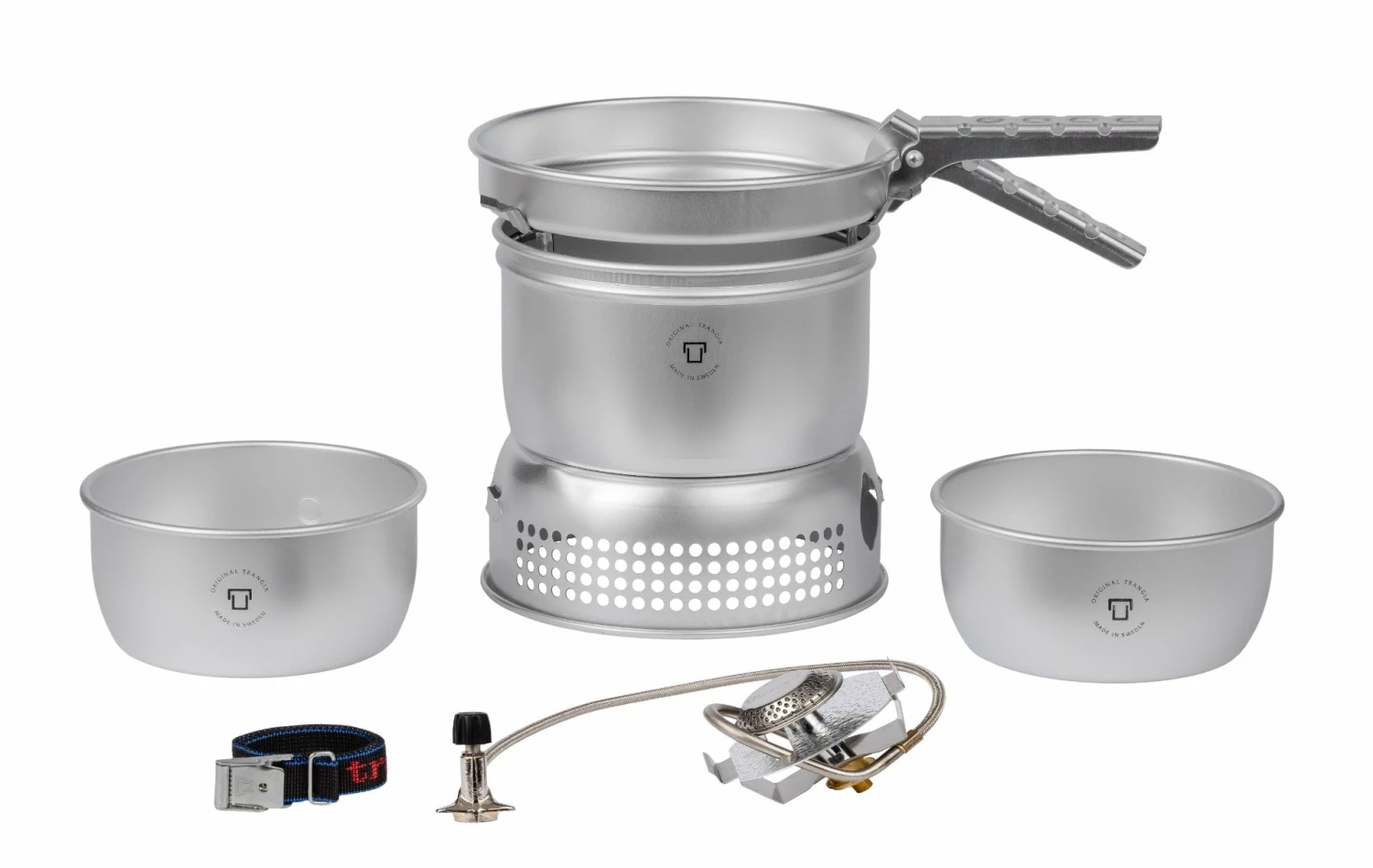 TRANGIA STOVE 27 SMALL is suitable for 1-2 people. All our 27 series stove sets include two one-litre saucepans (one inner, one outer), a frypan, a windshield (upper and lower part), burner, handle and strap.