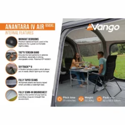The Vango Anantara IV Air 650XL is a 6-man inflatable tent features the award-winning AirBeam S.I Pro® Single Point Inflation System for easy pitching and a pre-attached front awning for a separate living area. Its Tinted Diamond Pro windows, Midnight Bedroom technology, SkyLight Windows and Villa Construction offer enhanced privacy, insulation and brightness. The 5,000mmHH waterproof Sentinel Elite Fabric and ColourLok™ technology provide exceptional performance and climate control. Optional zip on Studios extend your space and make it an ideal tent for family camping holidays.