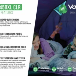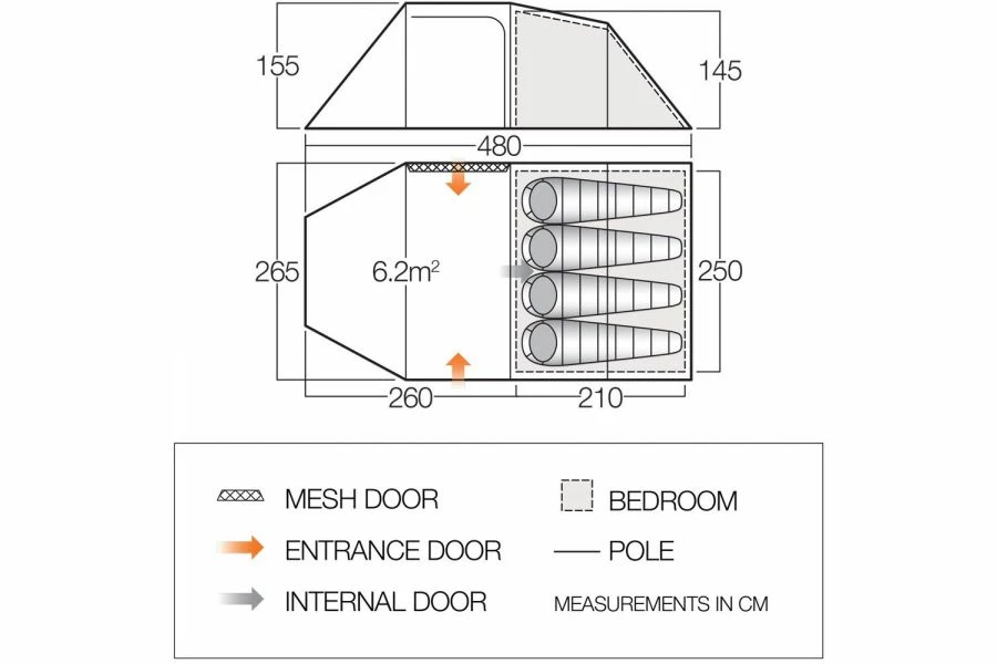 - Linked-In Groundsheet – Easy to clean groundsheet that can be attached or detached from the living area. Simply roll under the bedroom area when not required