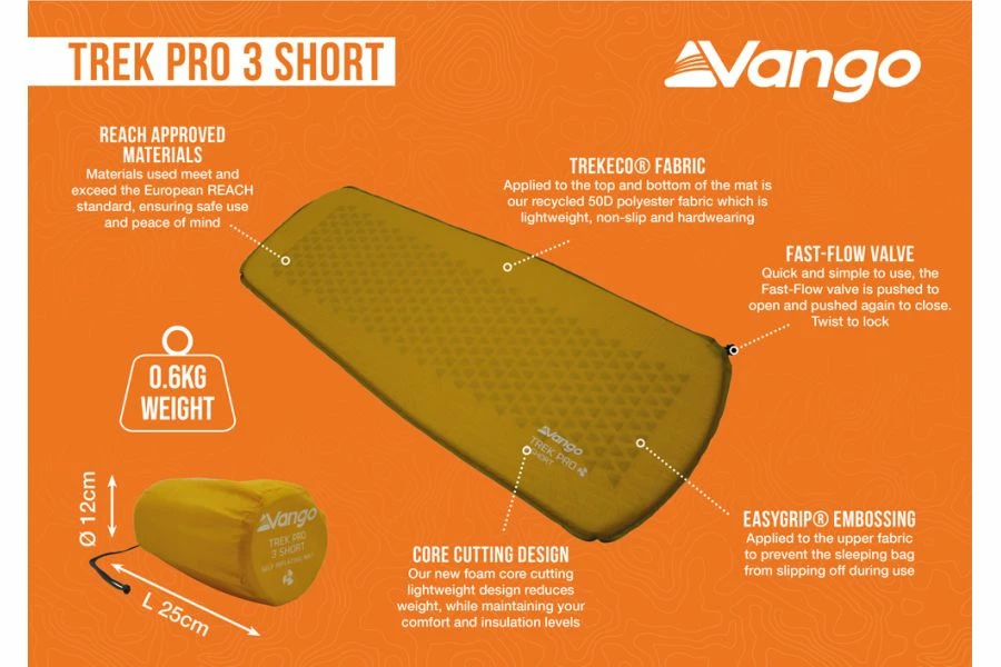 The Vango Trek Pro 3 Short mat is crafted from recycled TrekEco® Fabric, perfect for eco-minded adventurers. Its Core Cutting Design offers reduced weight and retained insulation and comfort. Further, its EasyGrip® Embossing ensures secure footing, while the Fast-Flow Valve allows quick inflation and deflation.